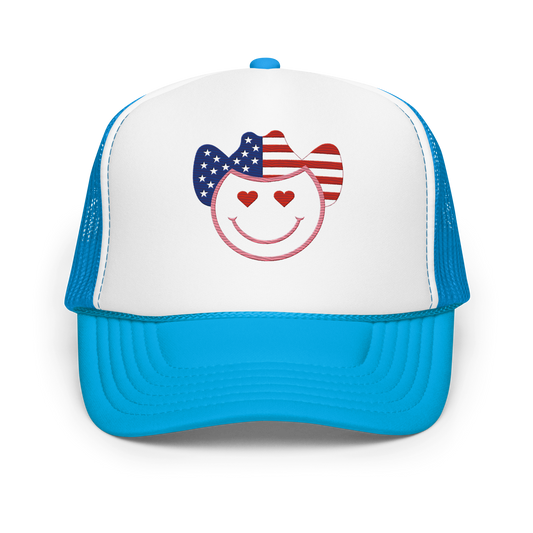 “All-American Heart Eyes” Trucker Hat – Country Cute with Star-Spangled Style