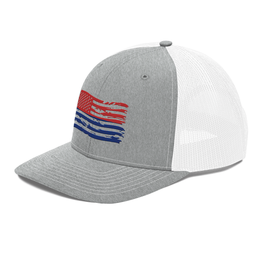 Red & Blue Distressed American Flag Trucker Cap – Mesh Back, Snapback Fit
